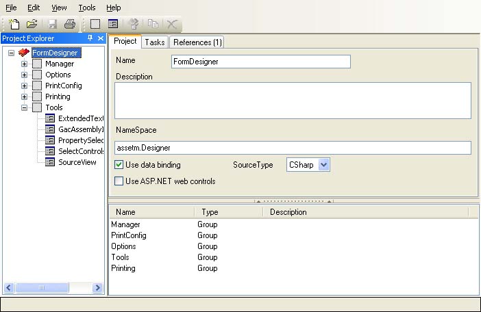 Selecting the project itself at the root of the Project Explorer (as shown above) allows you to set global project preferences such as the target programming language — currently VB.NET and C# are supported — or the namespace that should be added to the generated code.
