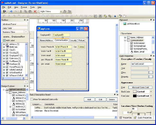 The form.suite4.net Form Designer is a professional graphical user interface design tool for .NET Windows Forms. Here you design the forms, add controls and set their properties.