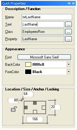 The QuickProperties Editor provides an alternative to the Property Grid. While both perform essentially the same function — allowing you to modify properties of forms or controls — the QuickProperties Editor contains only the most relevant properties that you are most likely to use during day-to-day form design tasks.