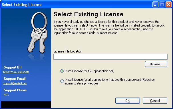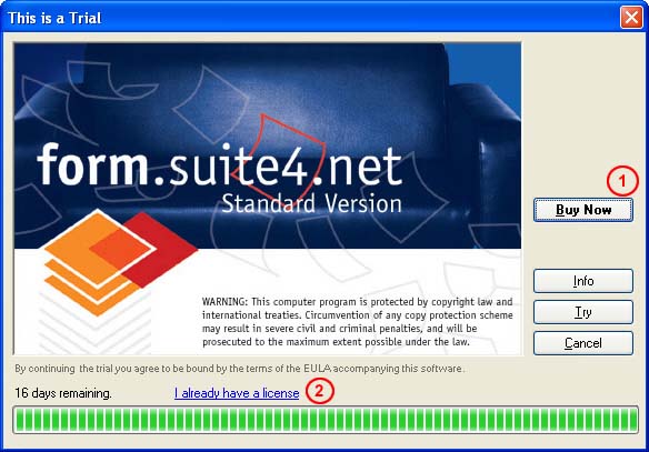 Clicking on "Buy Now" (1) will take you to a purchasing page at http://www.suite4.net where you can acquire a license for continued use of the product beyond the end of the trial period. After payment has been received an email containing a license file will be sent to you.